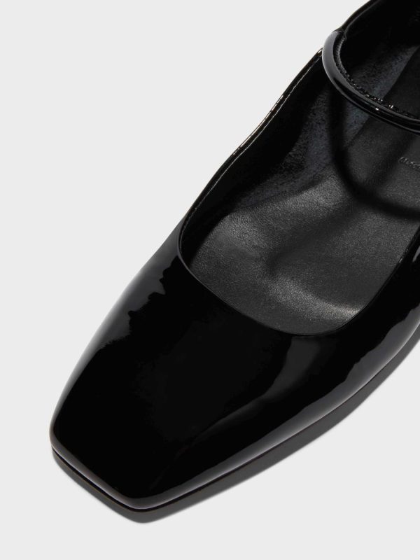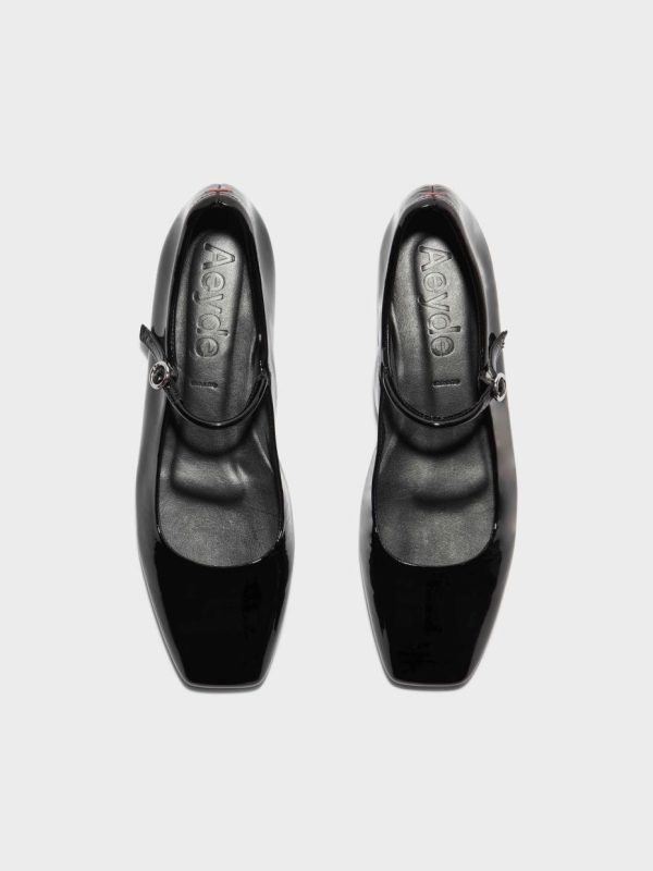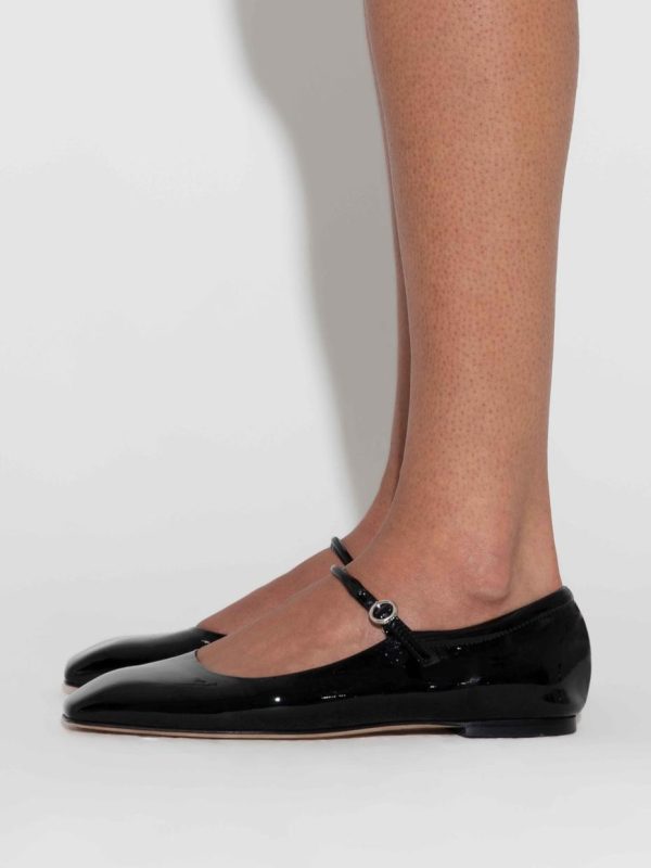 Uma is a design that leads Aeyde’s repertoire of flats. This pair is crafted from high-shine patent leather and features established brand signatures–from the sloped, squared toes to the tubular straps reminiscent of piping on tailoring.