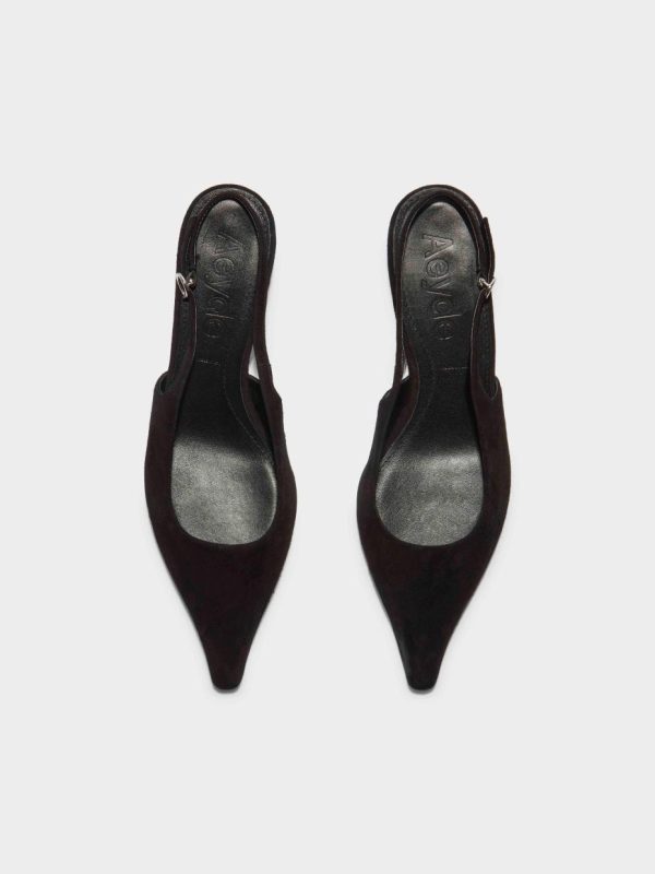 Aeyde’s elegant chisel-toe pumps featuring tapered kitten heels, adjustable slingback straps, and bespoke anti-slip soles. This season, we introduce Catrina in soft kid suede.