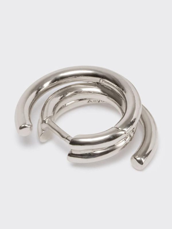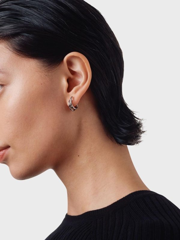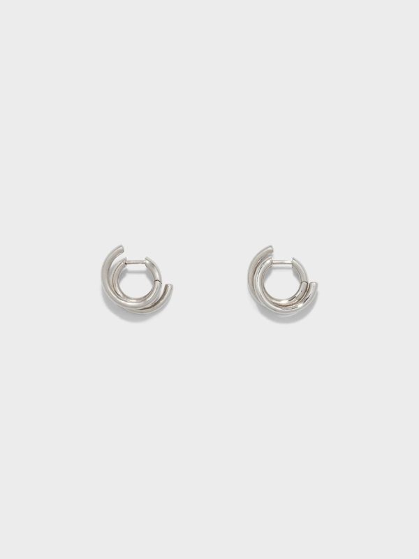 Dean explores the concept of wires in the most versatile earring shape–hoops. This pair is made from silver-toned palladium-plated brass that will maintain its sheen, even when worn close to the skin regularly.