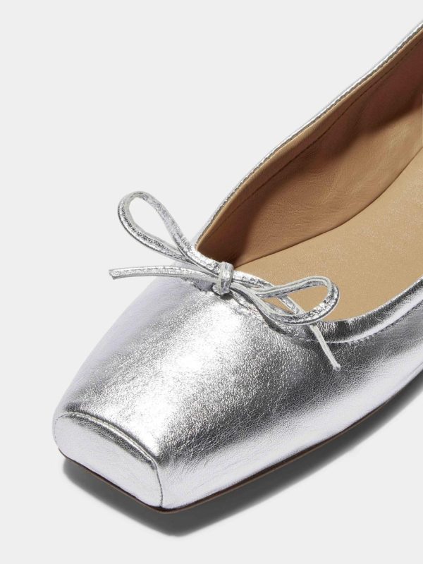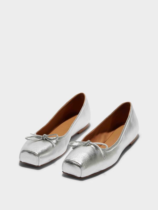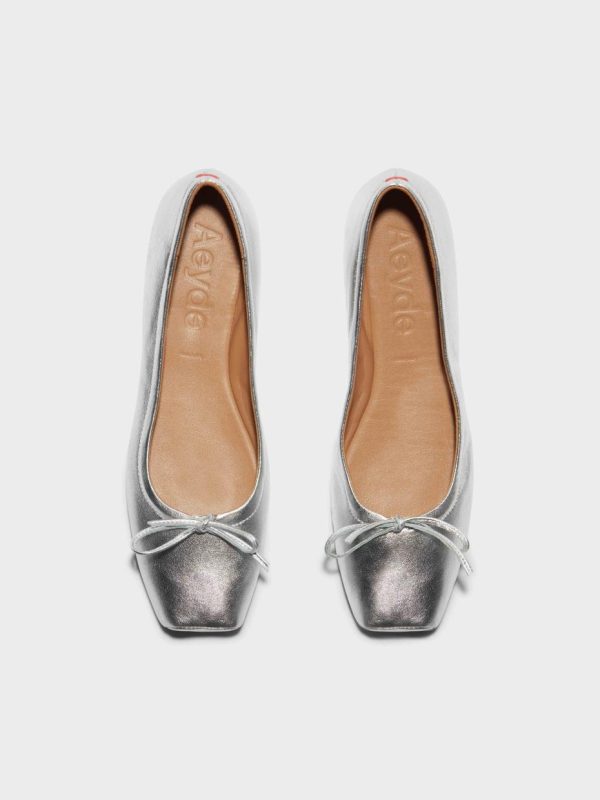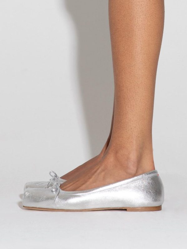 A directional take on traditional balletic styles, the new Gabriella flats expand on Aeyde’s square-toe series. Crafted from laminated silver leather in the sacchetto technique, which ensures flexibility and comfort, this can be folded for added versatility.